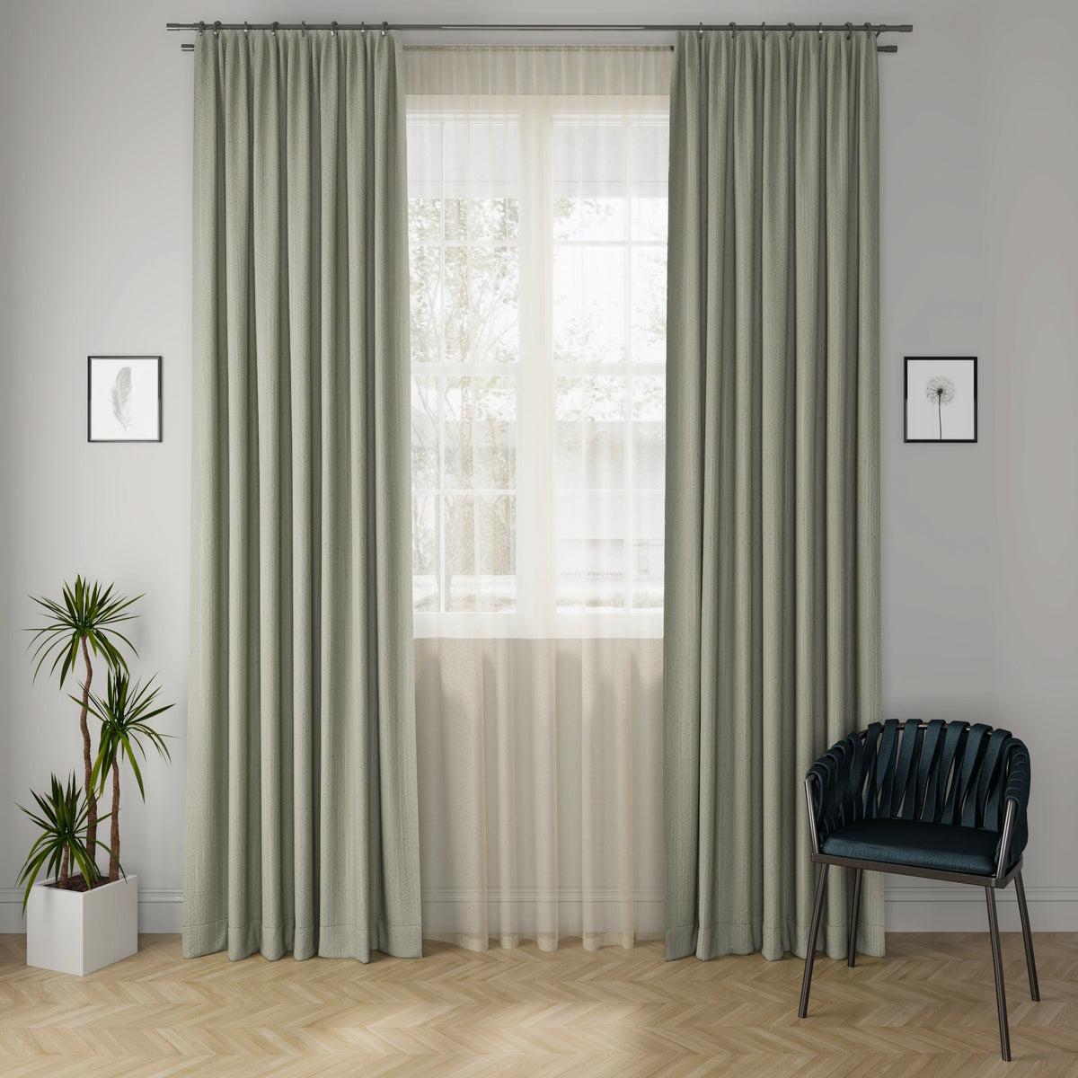 A premium linen-blend drapery in a warm Celery shade, combining durability, natural texture, and an elegant fall.