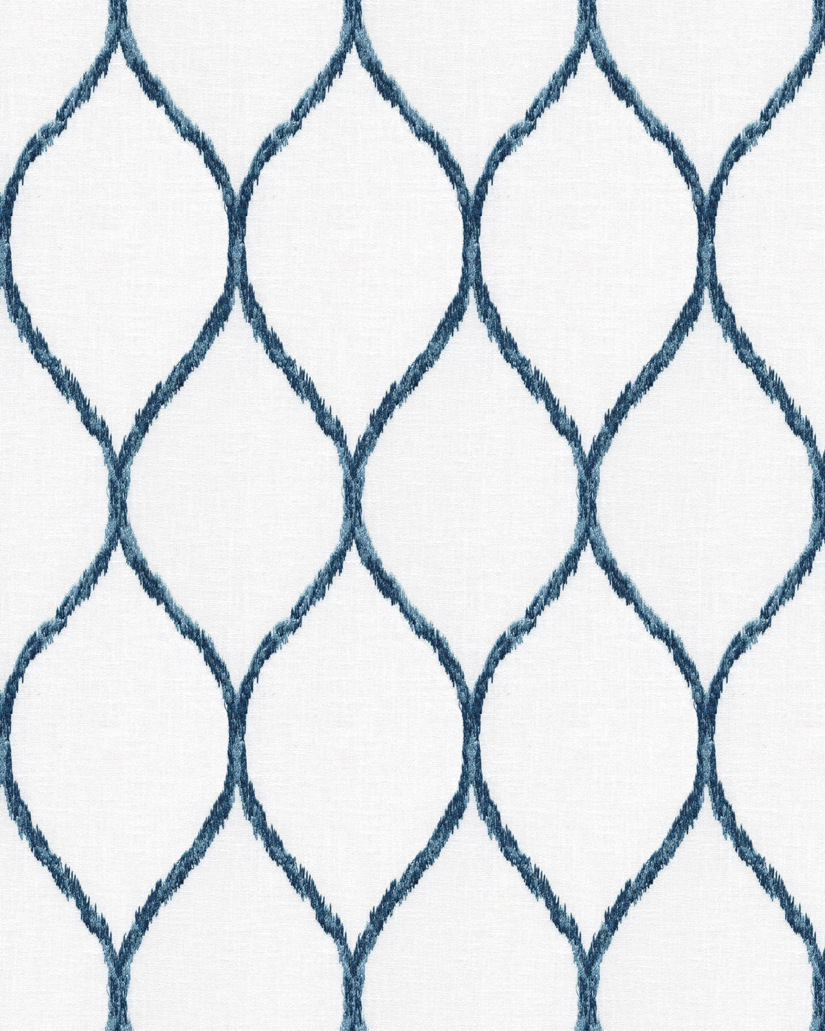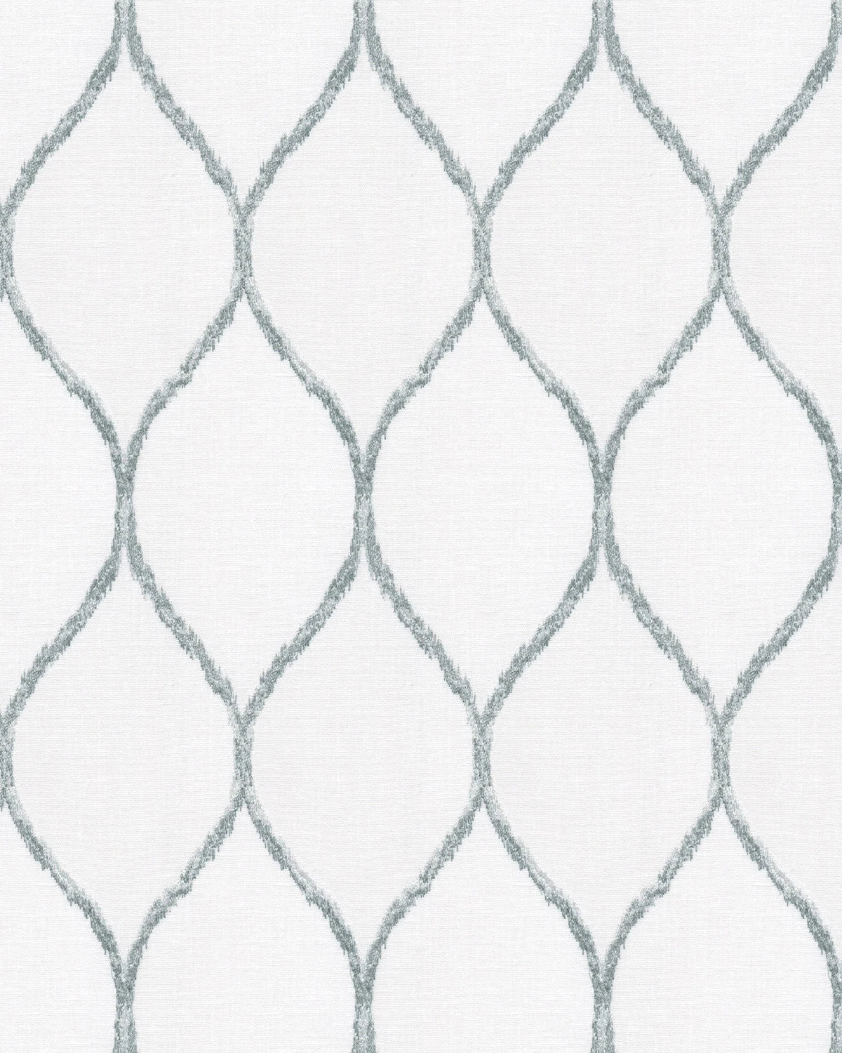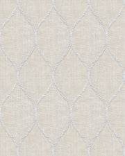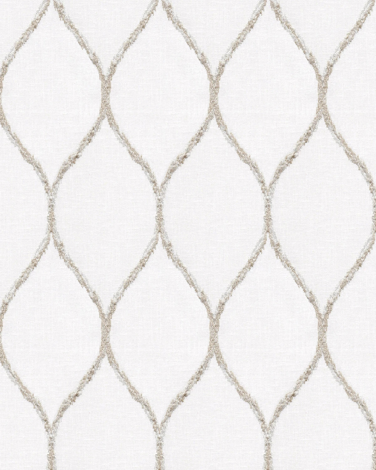 Lattice/Ogee cotton-linen-rayon blend fabric with contemporary embroidery, ideal for drapery and bedding.
