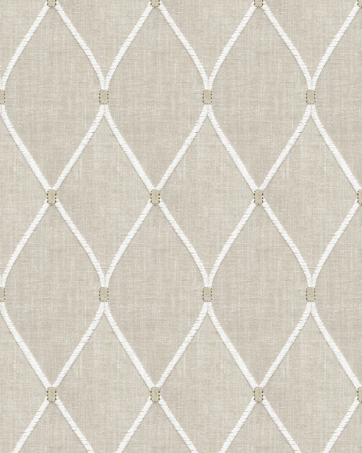 Ogee-style cotton-linen-rayon blend embroidery, refined and decorative, ideal for drapery and bedding.