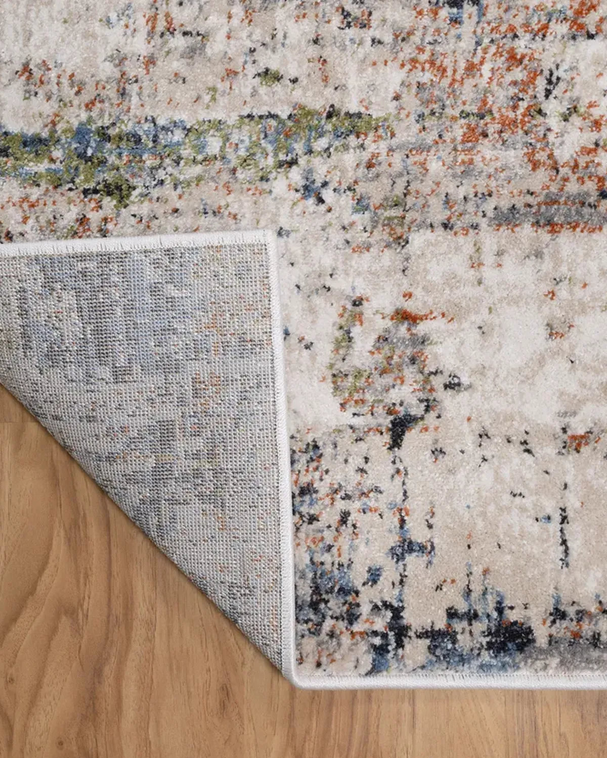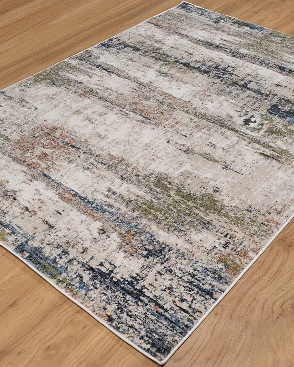 Abstract modern carpet in light beige, green, blue, and earthy tones; hand-tufted wool-blend rug for serene interiors.