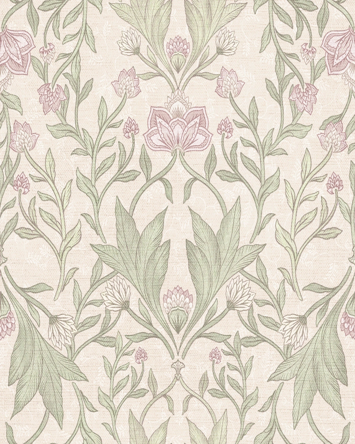 Vintage Morris-style floral damask wallpaper in ivory pink — romantic and timeless.